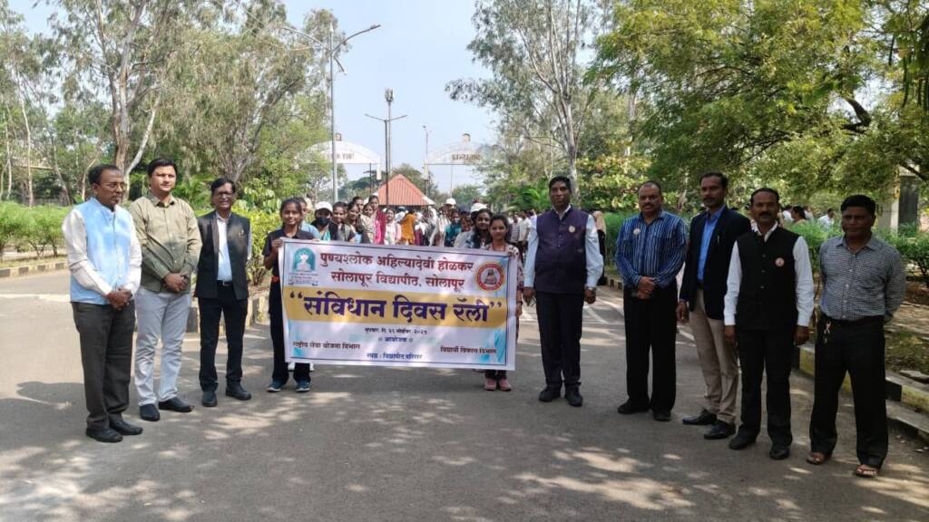 सोलापूर – पुण्यश्लोक अहिल्यादेवी होळकर सोलापूर विद्यापीठात संविधान दिन उत्साहात आणि शिस्तबद्ध वातावरणात साजरा करण्यात आला. विद्यापीठाच्या मुख्य प्रवेशद्वाराजवळ उभारलेल्या संविधान उद्देशिकेच्या स्तंभास कुलगुरू डॉ. प्रकाश महानवर यांच्या हस्ते पुष्प अर्पण करून अभिवादन करण्यात आले.