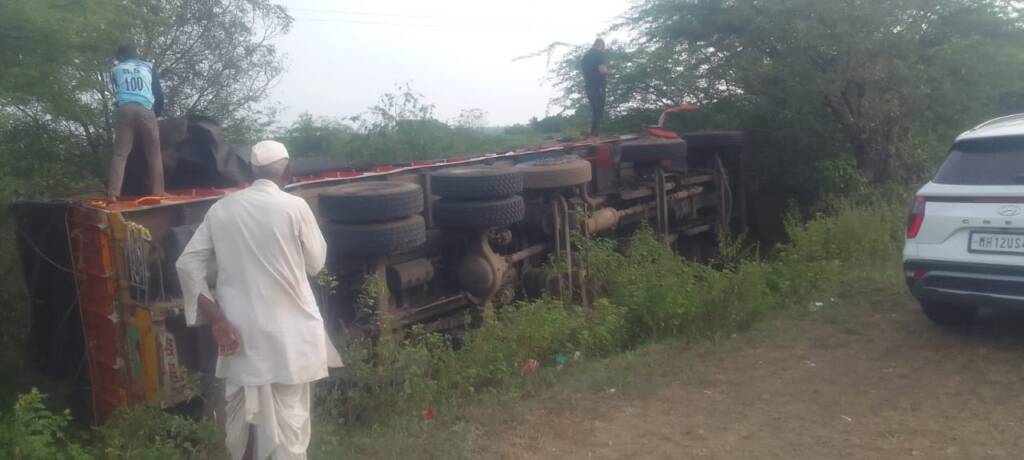 कांद्याने भरलेला ट्रक रस्त्याच्या कडेला पलटी झाल्याने काही काळ वाहतूक विस्कळीत झाली होती. स्थानिक नागरिकांनी मदतकार्य करून वाहतूक पूर्ववत केली.