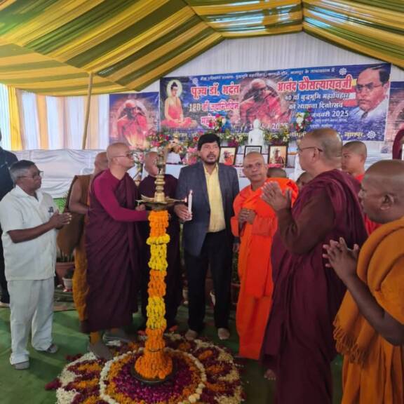 नागपूर प्रतिनिधी:पुज्य भदंन्त डॉ.आंनद कौशल्यायन यांच्या 140व्या जयंती निमित्त आयोजित कार्यक्रमाचे उद्घाटन रिपब्लिकन पक्षाचे राष्ट्रीय अध्यक्ष केंद्रीय सामाजिक न्याय राज्यमंत्री ना.रामदास आठवले यांच्या हस्ते बुध्दभुमी महाविहार कामठी रोड नागपुर येथे करण्यात आले.यावेळी भंन्ते प्रज्ञा ज्योती भंन्ते बोधानंद,भंन्ते नागदिपनकर,भंन्ते सत्यशिल महाथेरो,भंन्ते यश,भंन्ते मैत्री महाथेरो श्रीलंका व रिपब्लिकन पक्षाचे अनेक कार्यकर्ते उपस्थित होते.